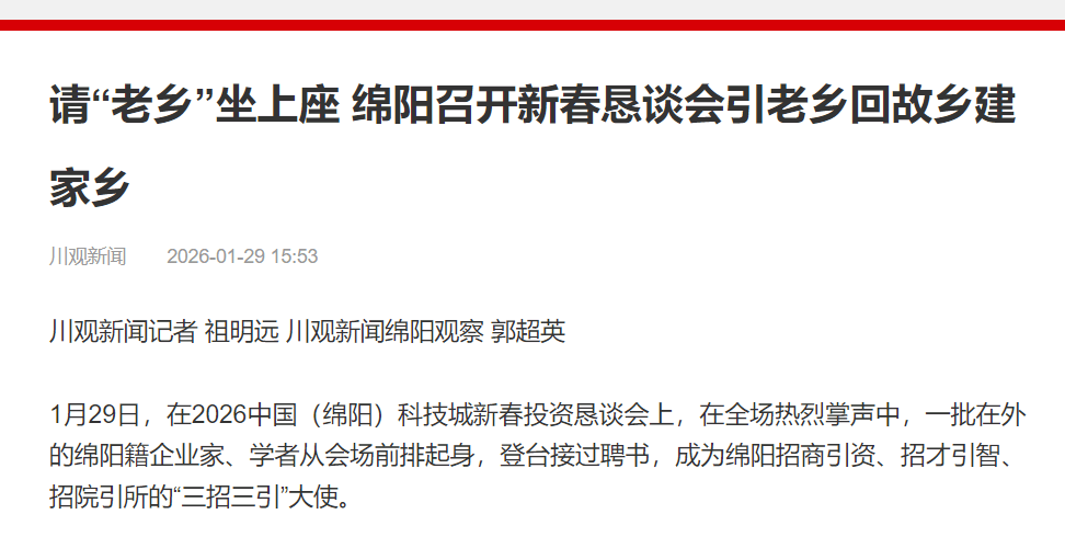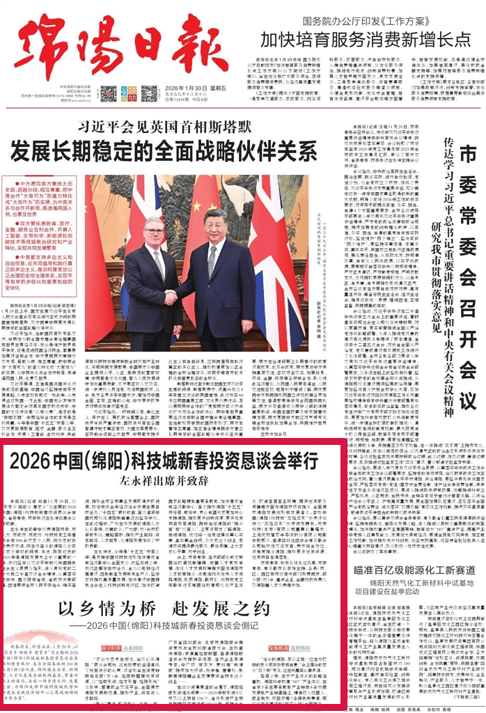 1月30日,《绵阳日报》头版报道“引老乡 回故乡 建家乡”—2026中国(绵阳)科技城新春投资恳谈会举行。